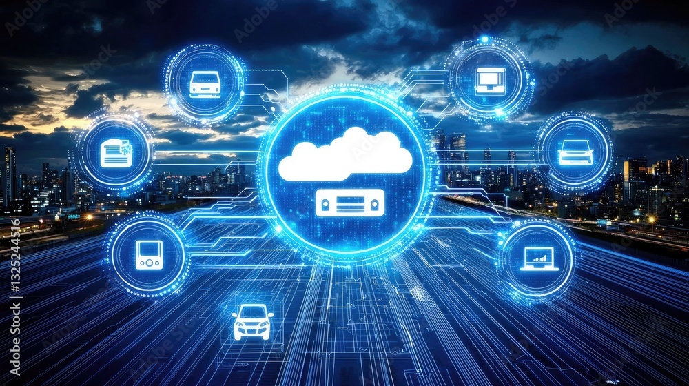 Cloud computing network over city road speeds up data flow. Use for tech solutions #1325244516