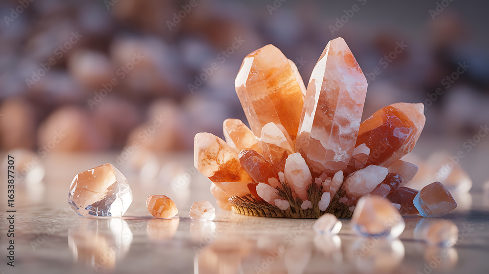 Cluster of orange crystals, surrounded by smaller gems. #1633877307