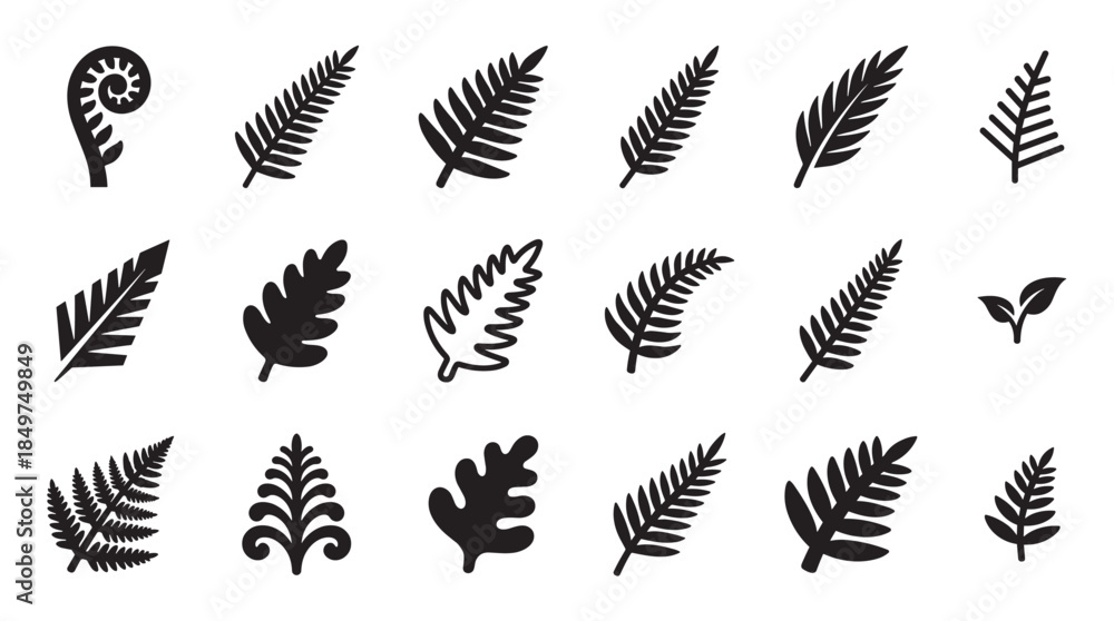 Collection of black fern leaf icons and frond silhouettes in various graphic styles, including a koru fiddlehead, presented as a botanical design element set for nature themes #1849749849