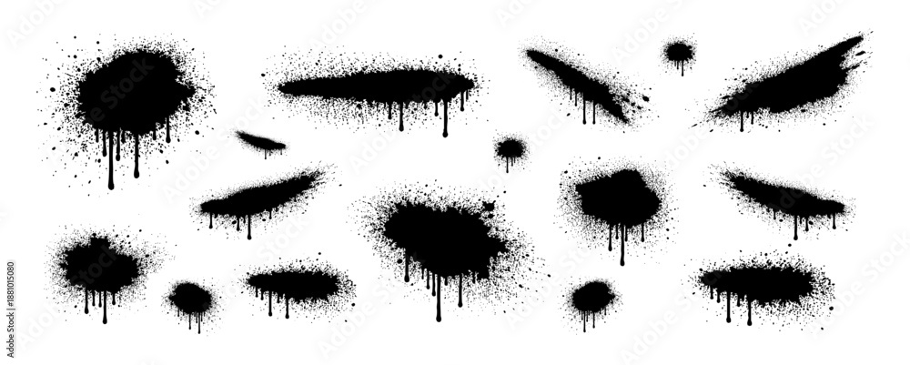 Collection of black spray paint splatters and drips. Grunge graffiti ink blots and stains isolated on white background. #1881015080
