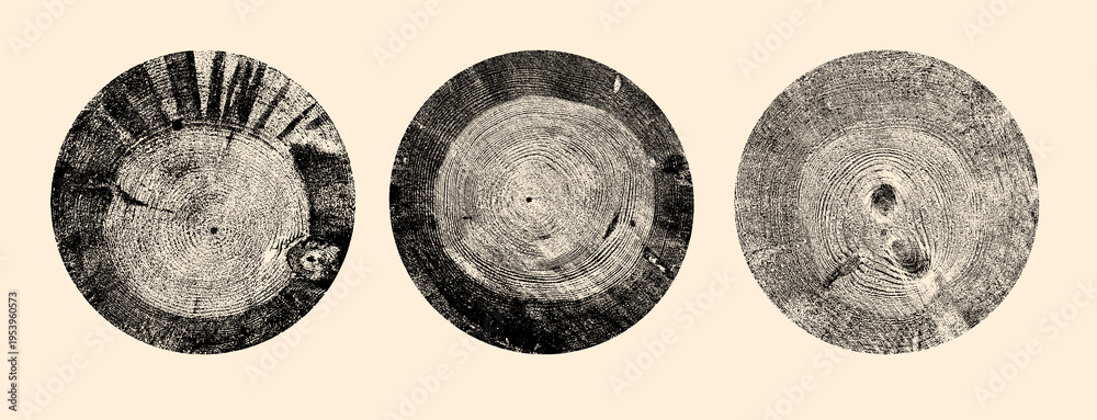 Collection of tree ring cross sections, wood slices isolated. Tree stump cuts with natural growth rings, trunk slabs, detailed ring patterns. Organic wood texture elements for background design. #1953960573