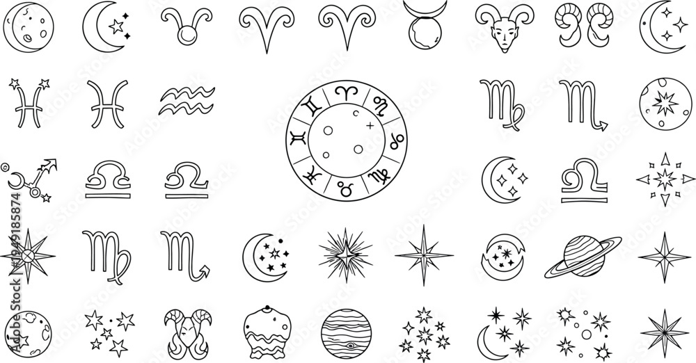 Collection of various astrology zodiac sign symbols isolated on transparent background #1949185874