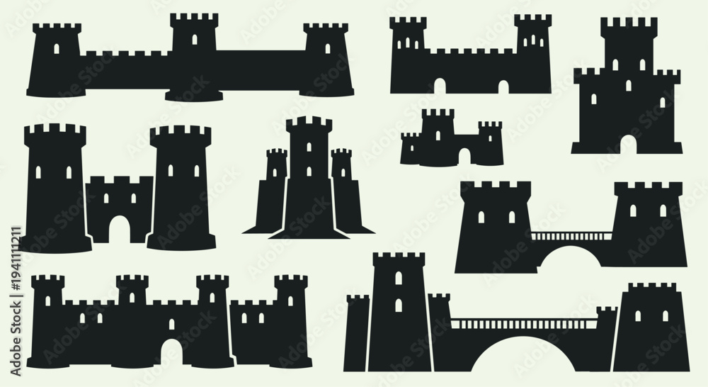Collection of various medieval castle silhouettes on a light green background, Generative AI. #1941111211