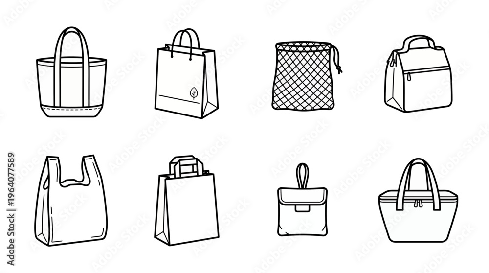Collection of various reusable shopping bags and ecological containers in hand drawn line art style on white background, concept for retail branding, sustainable marketing and lifestyle promotion #1964077589