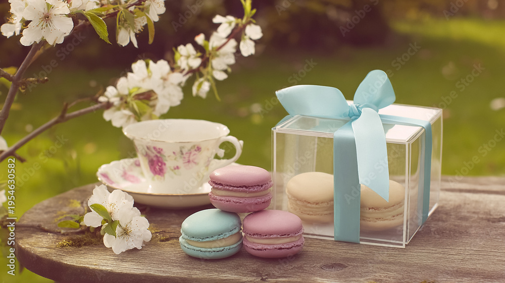 Colorful macarons, teacup, and a clear gift box with bow under blossoming spring branches in a garden setting #1954630582