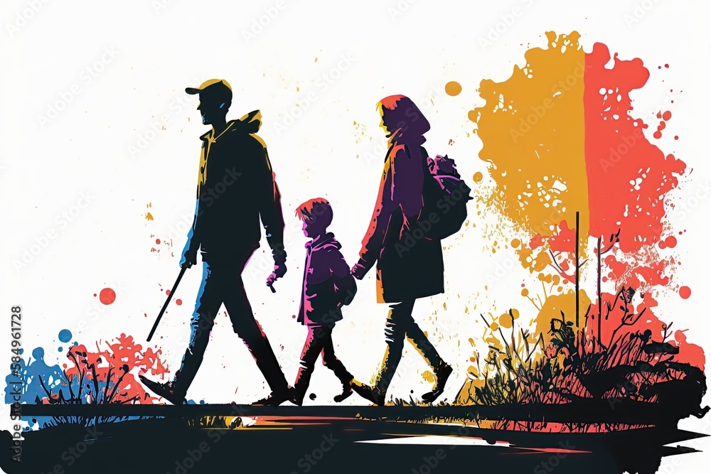 colorful pictogram of family hiking or walking, adventure, nature #584961728
