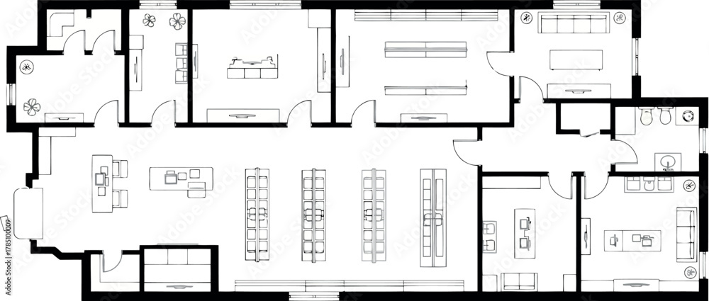 Commercial retail store floor plan with aisles, shelves, checkout counters, and back rooms #1785100009