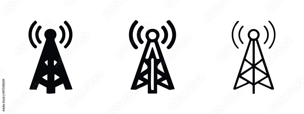 Communication Antenna Tower Icon Set, Mobile Network Signal Mast Vector, Broadcast Transmitter Station Icons #1975418509