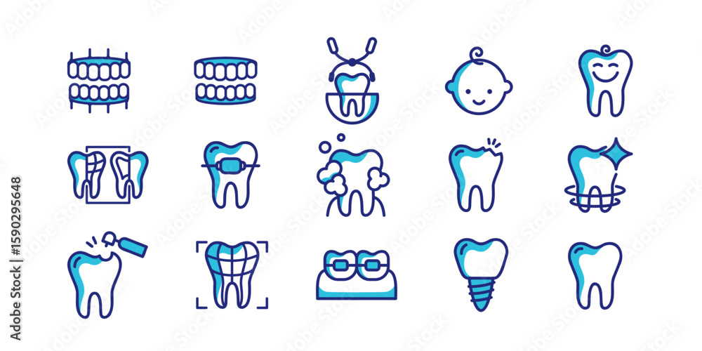 Comprehensive dental icon set - implants, braces, X-rays and pediatric dentistry. Modern flat vector designs for clinics, medical apps and dental healthcare presentations #1590295648