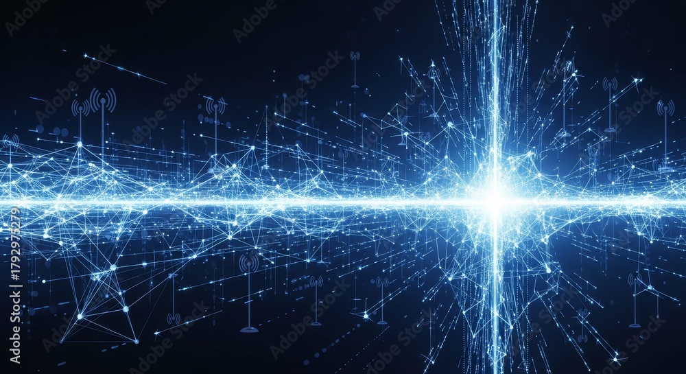 Connected Network Abstract Illustration - Futuristic network connection with glowing lines and wireless communication towers, representing technology and connectivity #1792975279