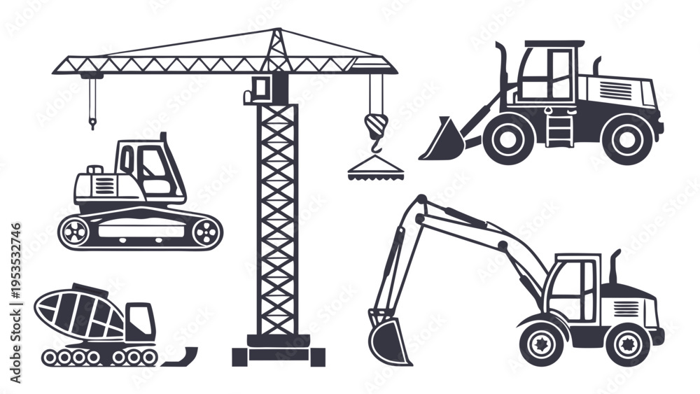 Construction Equipment Set Tower Crane Excavator Loader Cement Mixer Icons for Industry Development Projects and Heavy Machinery Design #1953532746