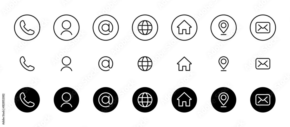Contact us icon set. Phone, user, mail, home and location elements in minimal outline and solid styles vector illustration. Web and app interface sign for communication and navigation symbol pictogram #1828152082