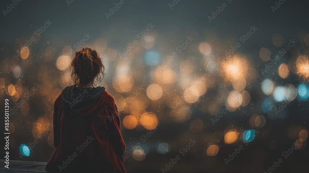 Contemplation Amidst City Lights: A solitary figure, cloaked in introspection, gazes upon the mesmerizing panorama of city lights, evoking a sense of calm and solitary #1855011399