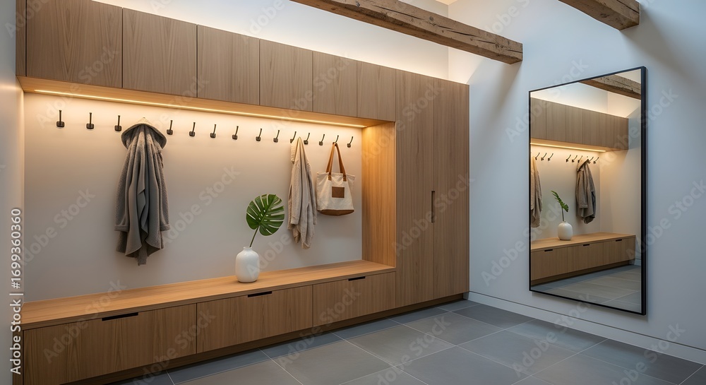 Contemporary hallway with light wood built in storage, a large mirror, and subtle lighting. Neutral color palette and clean lines create a calming atmosphere. #1699360360