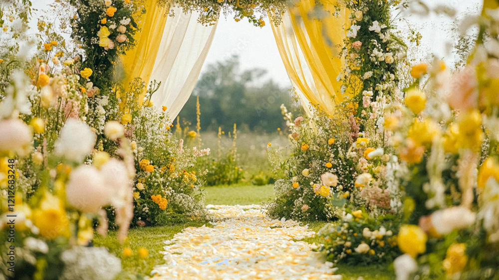 Cottage wedding decoration in the countryside, floral decor and event celebration, flowers, wedding aisle, wedding cake and tablescape, English country style idea #1212683248