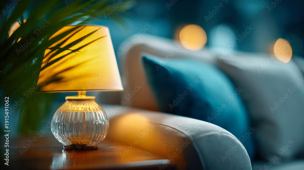 Cozy modern living room with a glowing table lamp and soft bokeh—concept of home privacy and hidden surveillance in a smart home #1915491062