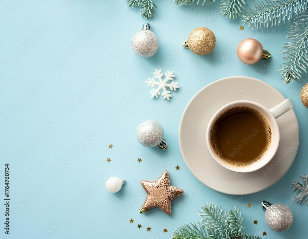 Creative concept photo of coffee cup with pastry and christmas decorations celebrating new year xmas holiday on blue background. #1764760734