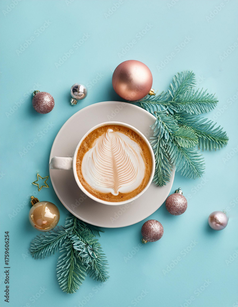 Creative concept photo of coffee cup with pastry and christmas decorations celebrating new year xmas holiday on green background. #1759606254