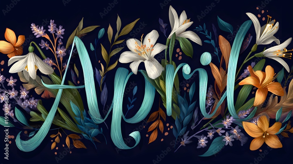 Creative Hand-Drawn April Lettering Art with Vibrant Natural Motifs Capturing the Rejuvenating Spirit of Spring #1953046867