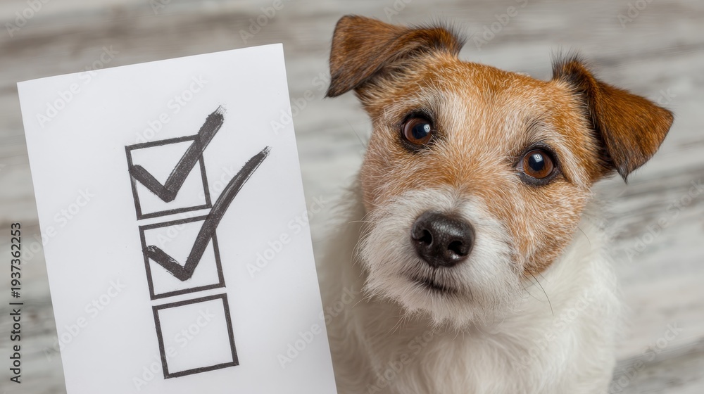 Curious Dog Looking at Checklist Paper – Pet Choosing or Decision Concept #1937362253