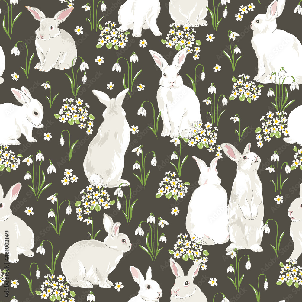Cute bunny in Spring Bloomy garden with snowdrops and primrose florals vector seamless pattern. Vintage romantic nature hand drawn print. Cottage core aesthetic background. #481002149