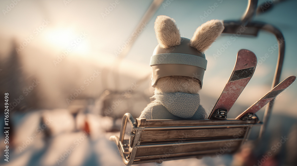 Cute Bunny Wearing Helmet and Ski Gear on a Ski Lift with Scenic Mountain View at Sunrise. Image made using Generative AI. #1765249498