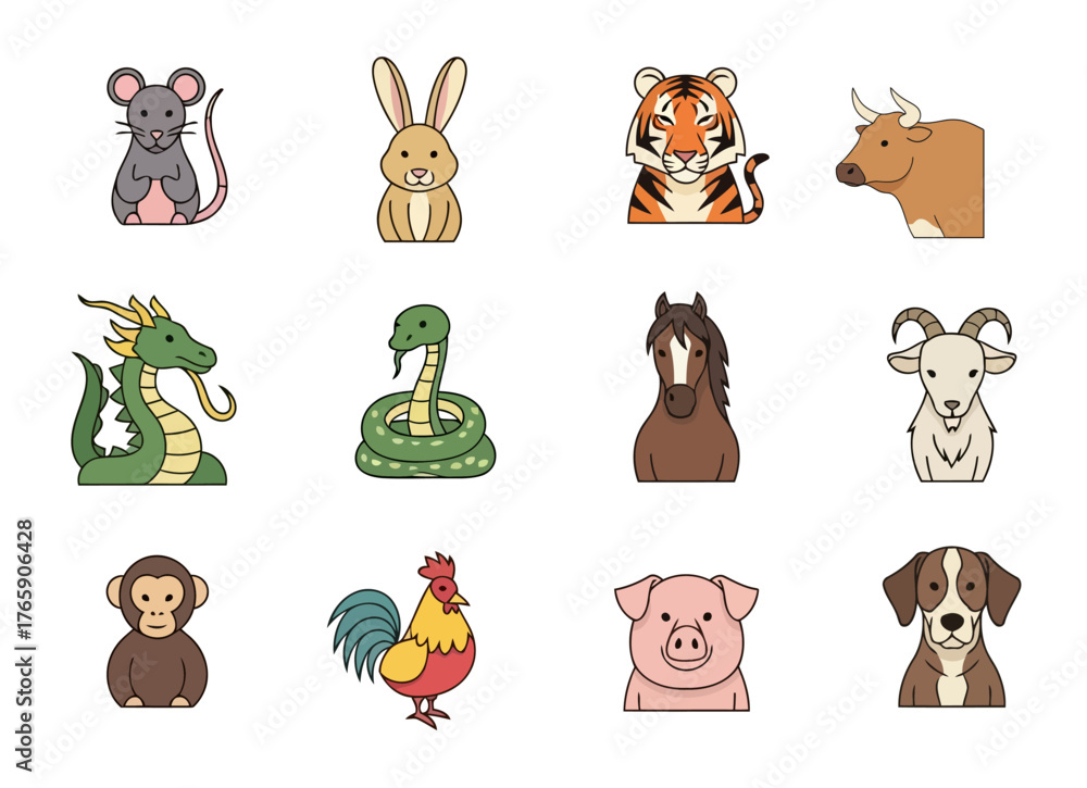 Cute cartoon animal icon set featuring Chinese zodiac, flat design, vector art #1765906428
