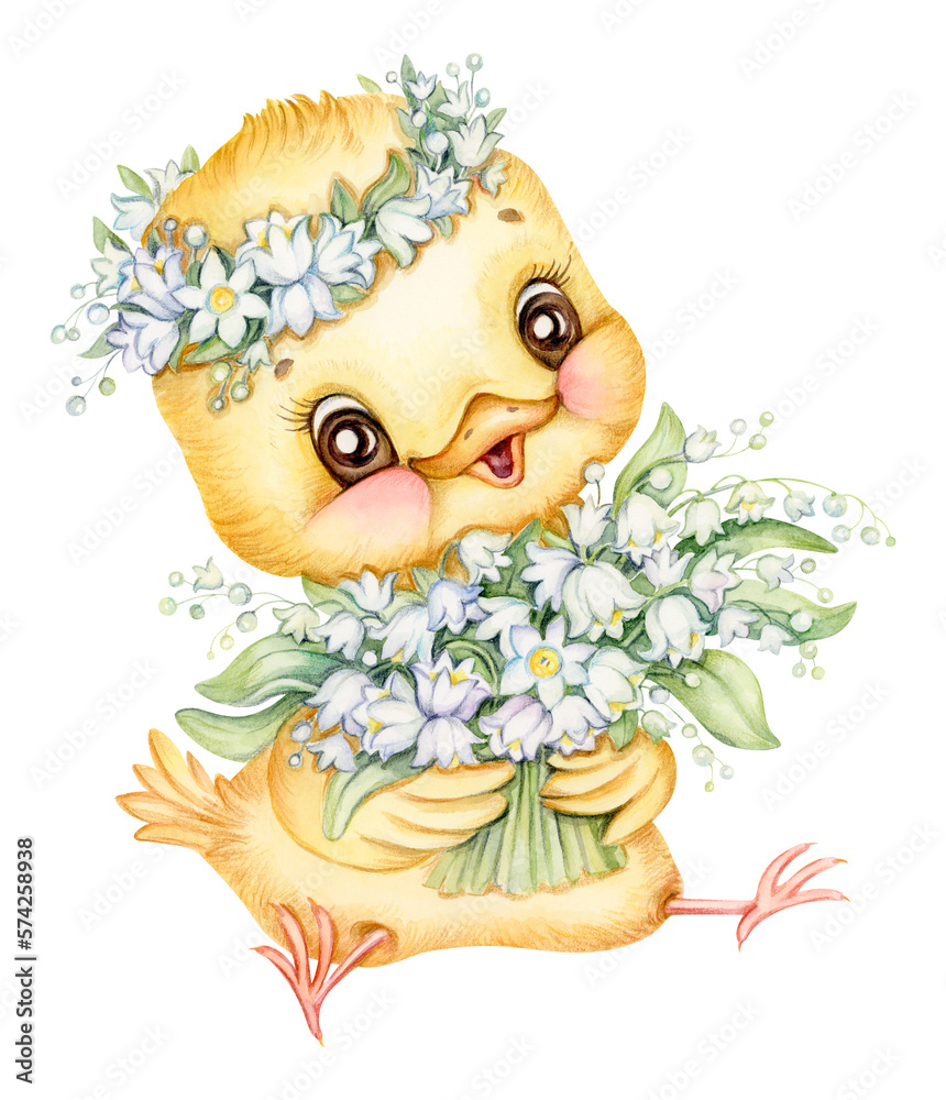Cute chicken with bouquet of lilies of the valley and floral wreath on head. Baby chicken with spring flowers Hand drawn watercolor illustration. Ideal for greeting birthday and invitation Easter card #574258938