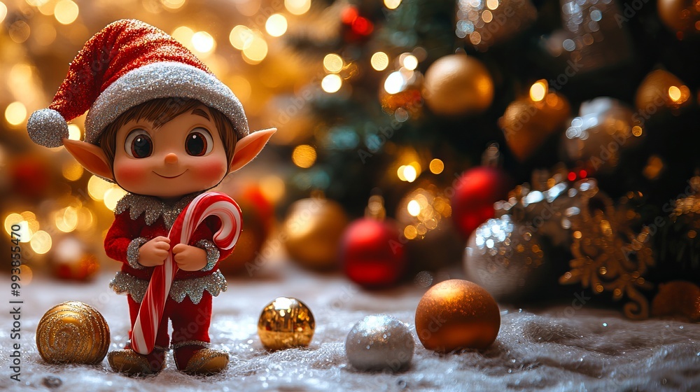 Cute Christmas elf holding a candy cane amidst festive decorations and glowing lights. Contains ample room for copyspace. #993855470