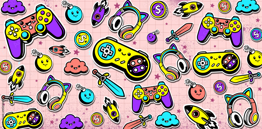 Cute Game background vector illustrations. Various game elements wallpaper in graffiti style #1958701487
