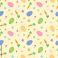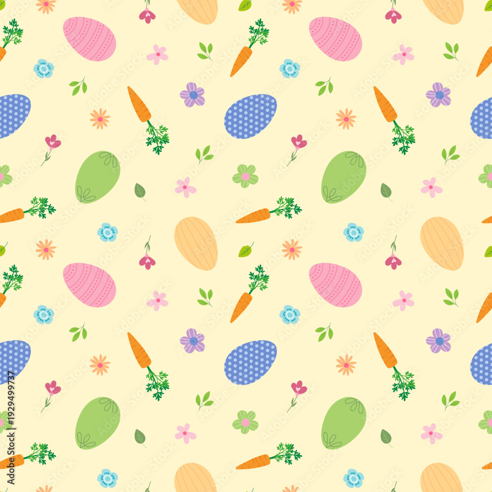 Cute seamless easter pattern with cartoon carrots, eggs and little flowers on a yellow background, perfect for kids' textile designs #1929499737