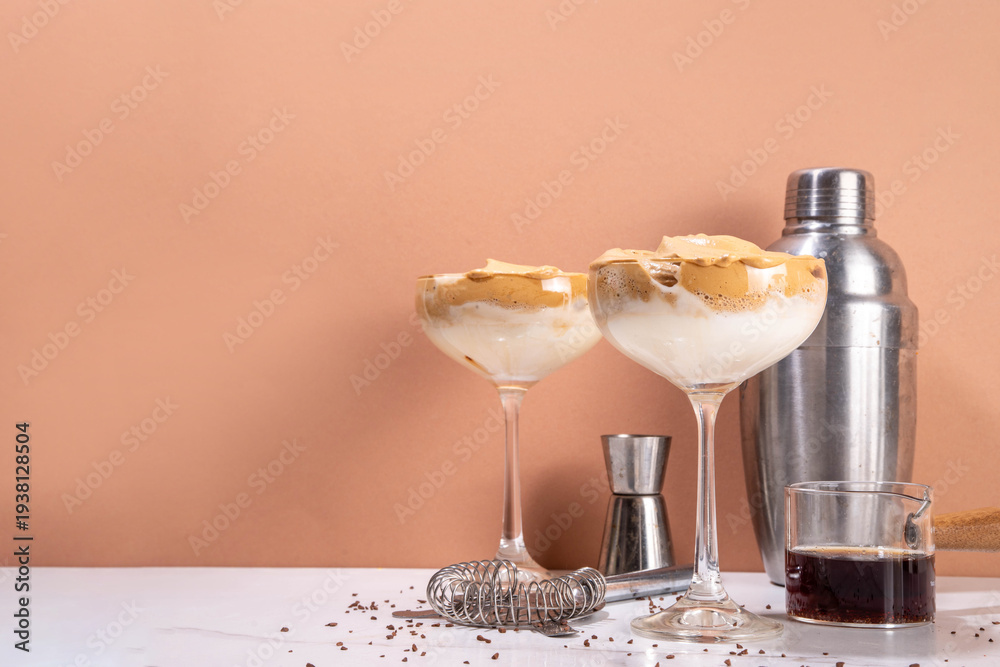 Dalgona espresso martini cocktail with whipped instant coffee and creamy liqueur, viral summer cocktail in two martini glasses, with shaker and bar utensils, copy space #1938128504