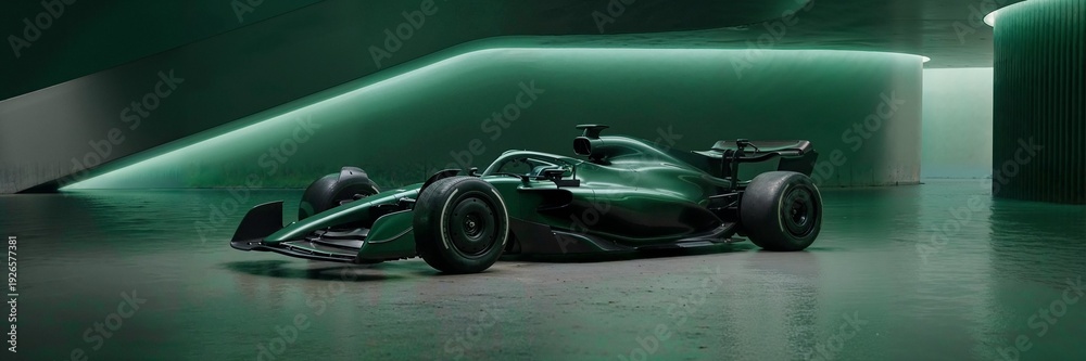 Dark green formula race car in minimal green illuminated interior. Concept of motorsport branding asset, premium automotive showcase, and performance focused advertising content. #1926577381
