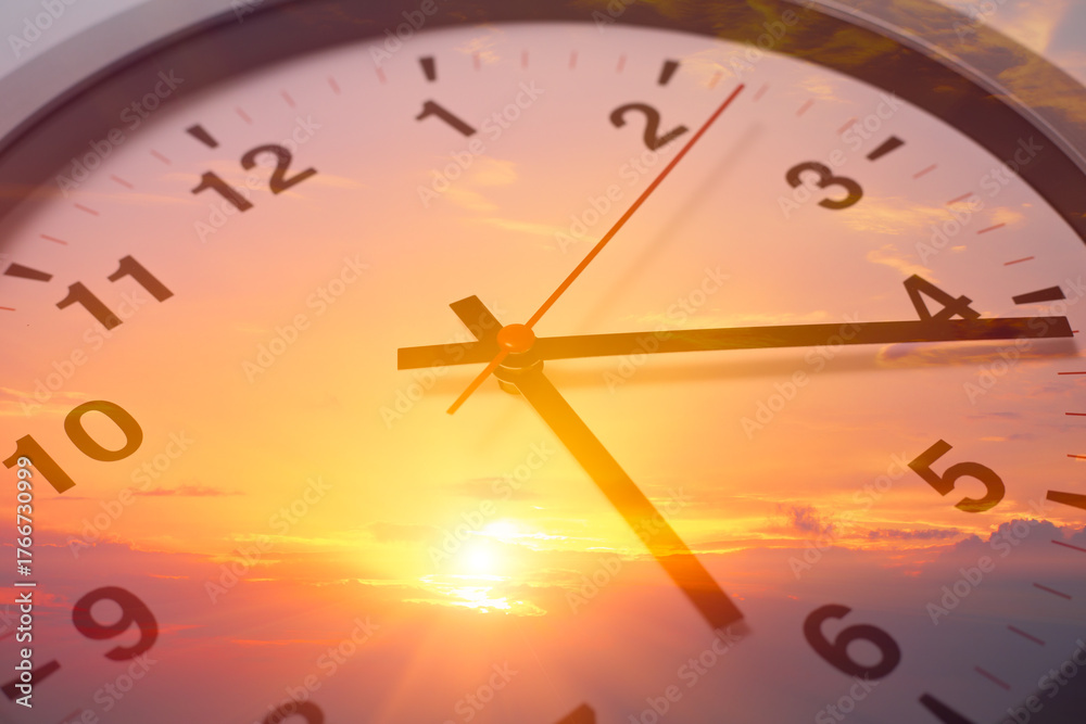 Day Time, Time clock face double exposure with summer morning sun rise beautiful sky background. #1766730999