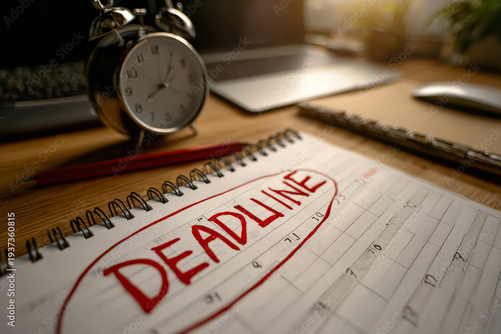 Deadline calendar notebook alarm clock reminder schedule office work planning Urgent deadline marked red calendar notebook with alarm clock wooden desk warm office light creating focused pressure #1937360815