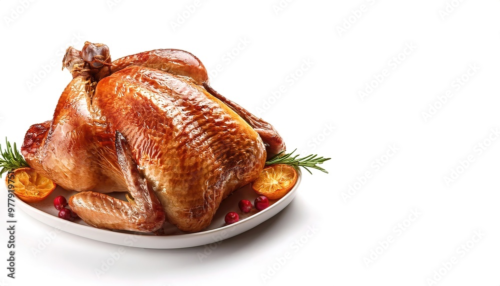 Delicious baked or broiled, juicy moist Thanksgiving turkey dinner on serving platter with vegetables. Before being carved. Pretty presentation full view Isolated on white background. #977919751