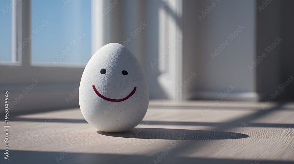 Delightful April Fool's Day Visual Narrative Featuring a Smiling Painted Egg in a Sunlit Minimalist Spring Setting with Whimsical Pranks and Vivid Artistic Design #1953046945