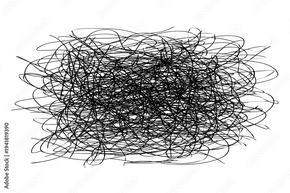 Dense chaotic scribble drawing isolated on white background representing anxiety, confusion and tangled thoughts. #1941819390