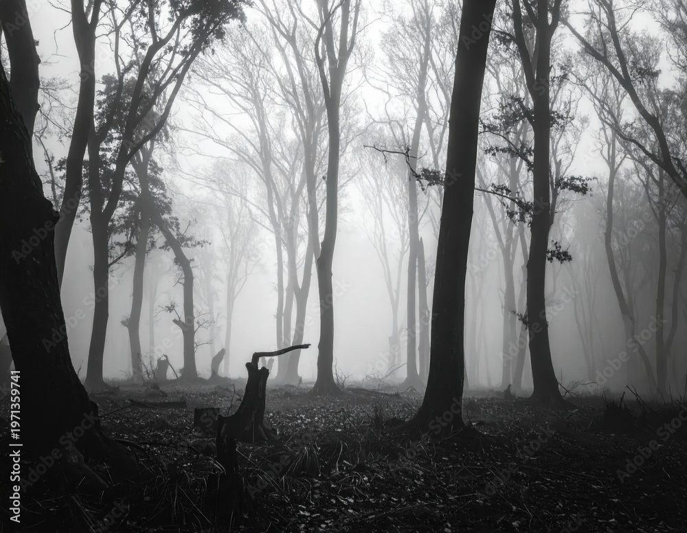 Dense forest silhouettes in deep fog with moody atmosphere, mysterious woodland landscape, monochromatic nature scenery, autumn stillness and calm #1971359741