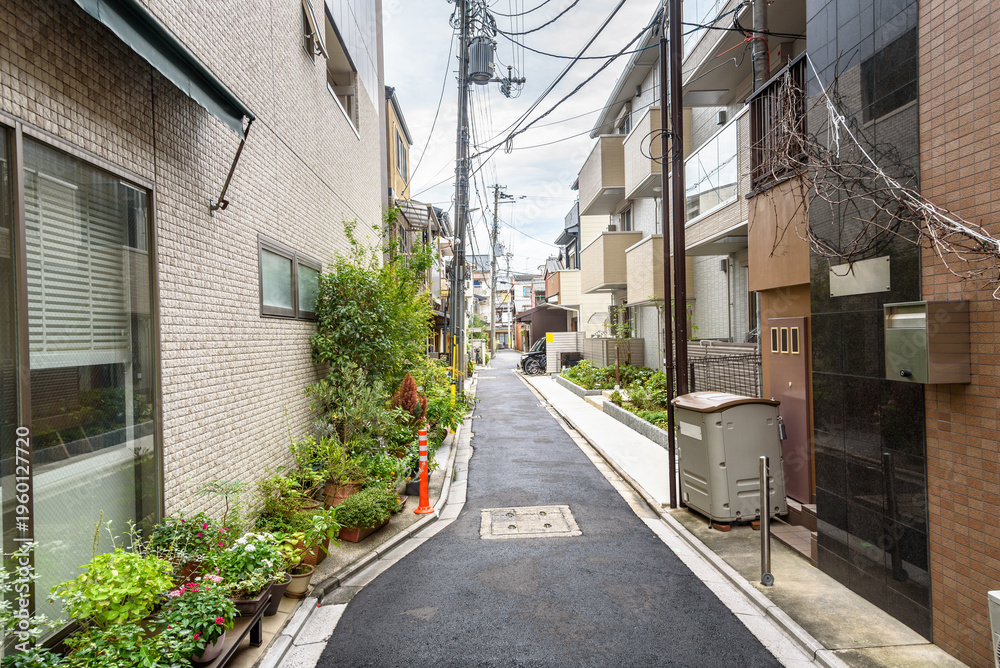 Deserted alley running between residential buildings on a cloudy autumn day. Kyoto, Japan. #1960127720