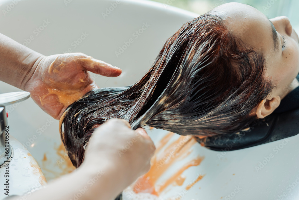 Detailed view of Southeast Asian woman’s hair as a stylist rinses out red hair dye after coloring at a beauty salon. #1660205562
