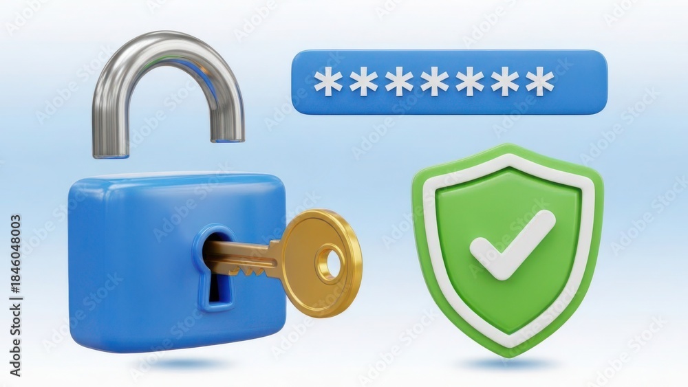 Digital security concept with padlock, key, hidden password, and shield for online protection #1846048003