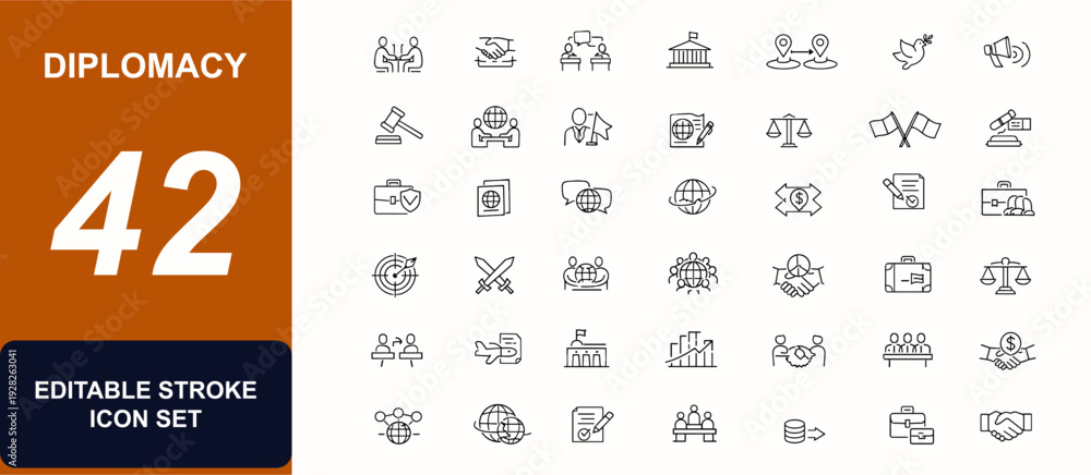 Diplomacy web icons in line style. International relations, ambassador meeting, government policy, consulate service, peace agreement set. Editable stroke. Vector illustration. #1928263041