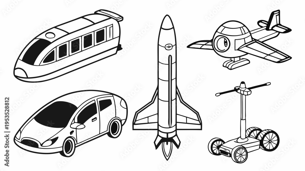 Diverse Transportation Icons Set Futuristic Travel Vehicles Rocket Car Train Airplane Scooter for Tech Web Design Illustration #1953528812
