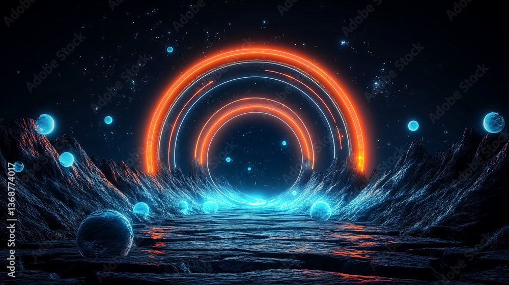 Dreamlike alien world, a visual spectacle of blue planets intertwined with red light halos #1368774017