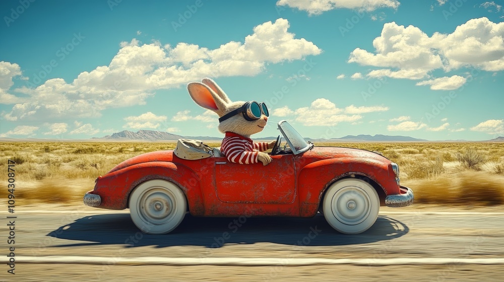 Easter Bunny Driving Vintage Convertible on Desert Road #1094308717