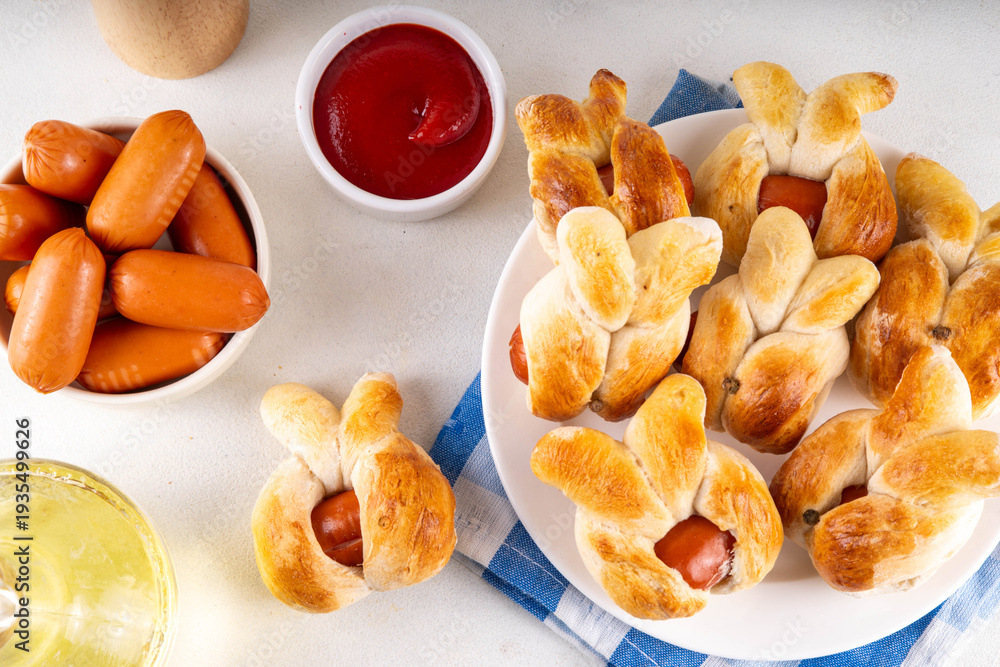 Easter Bunny Sausage Bread Rolls, Tasty Hot Dog buns in for of bunny faces, creative made food for Easter holiday party or brunch #1935499626
