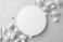Easter decor concept. Top view photo of ordered composition white circle yellow blue pink easter eggs and sprinkles on isolated pastel blue background with empty space #572563631