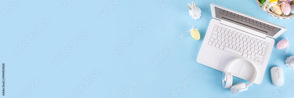 Easter office workplace, preparation for holiday, spring Easter sale, blogging. White laptop keyboard with easter eggs basket and flower branch decorations, on light blue wooden table top view #1944424868