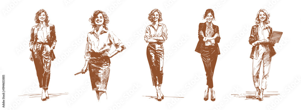 Elegant business woman professional confident standing pose. Modern female office character with stylish outfit and leadership presence. Pencil sketch drawing style. Banner for corporate presentation. #1944653885